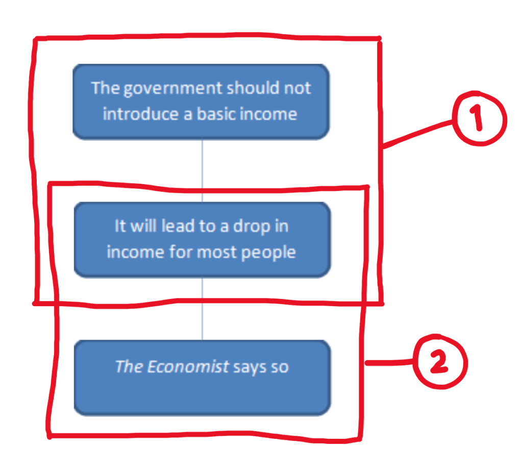 In the discourse, statements can play a double role. For instance, if a statement is supported by another statement and that statement itself is supported by yet another statement, the one in the middle functions as a premise for the first and as a conclusion for the last. An example is ‘According to The Economist, introducing a basic income will lead to a drop in income for most people. Therefore, the government should not introduce it.’ In this case, the argumentation contains two individual arguments: the first argument (indicated by 1 below) has the conclusion ‘The government should not introduce a basic income’ supported by the premise ‘It will lead to a drop in income for most people’. The latter statement also functions as the conclusion of the second argument (indicated by 2 below), where it is supported by the premise ‘The Economist says so’.